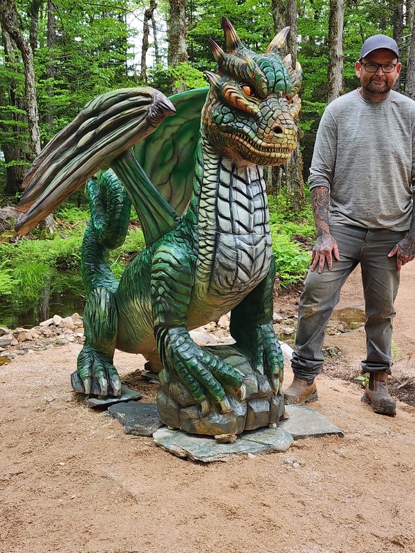 Lead sculptor/ chainsaw carver, Jay M. Is a master carver with an exceptional eye for details. Each carving starts with a client's idea , dream or a memory of a lost pet . Jay then chainsaw sculpts , and details down too tiny chisels and even airbrushing too recreate and bring too life the idea. If you have a idea or dream Jay will surpass your expectations and looks forward too discussing your dream sculpture.